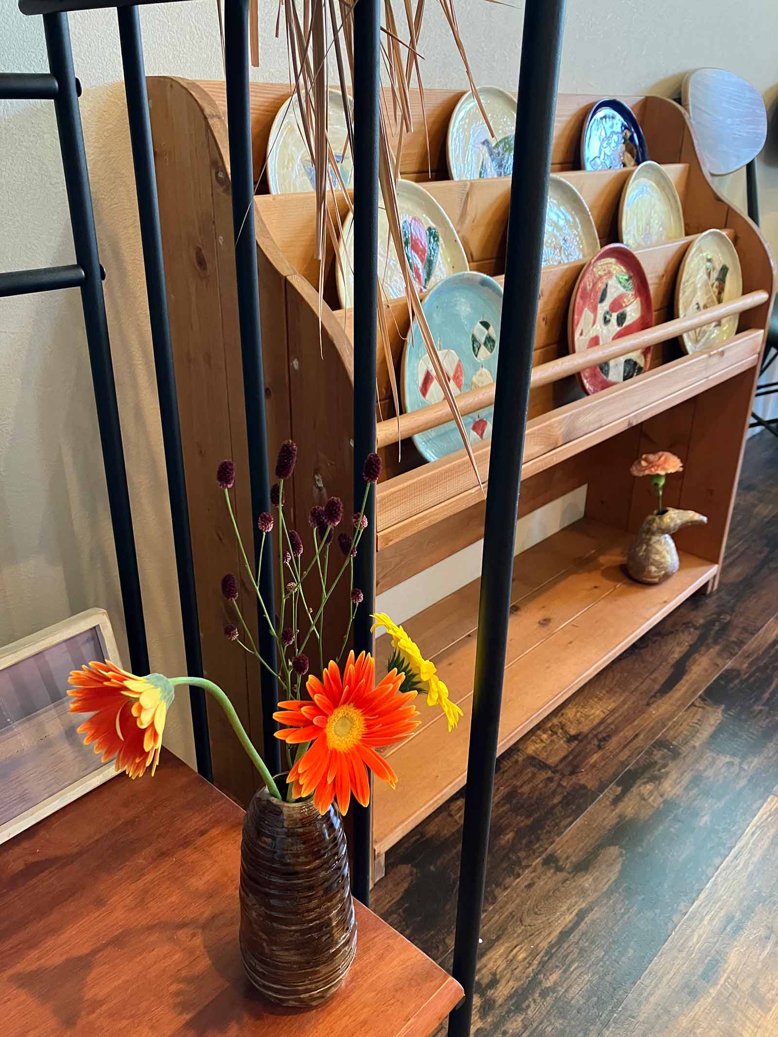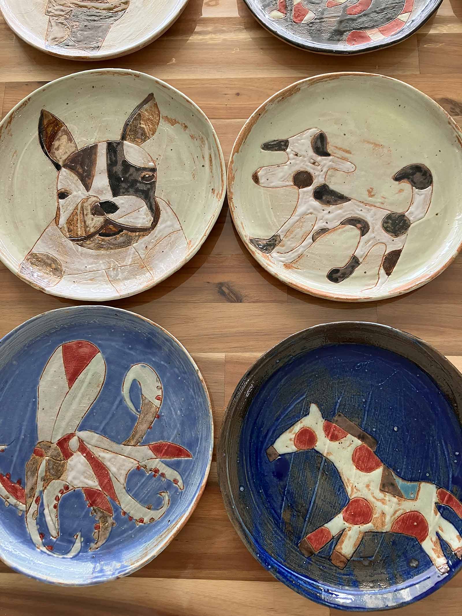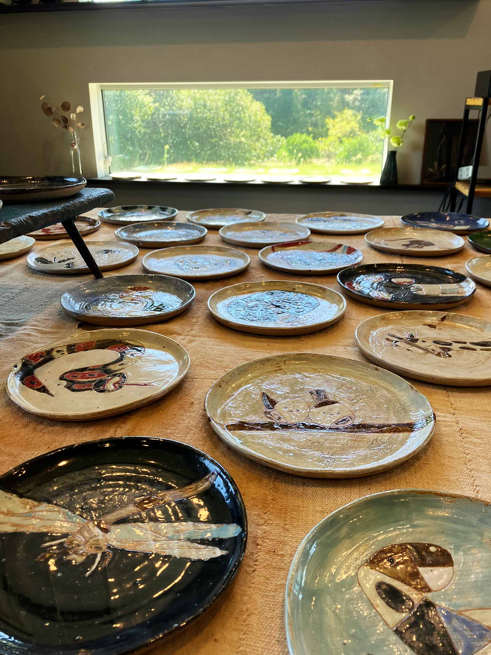 絵を考える→皿を作る→素焼きする→筆で釉薬をぬる