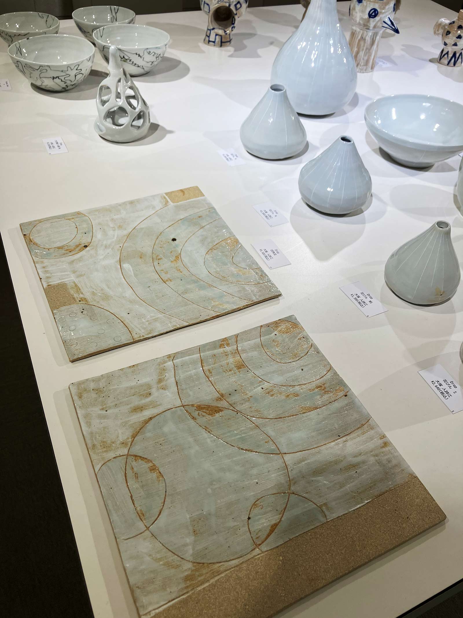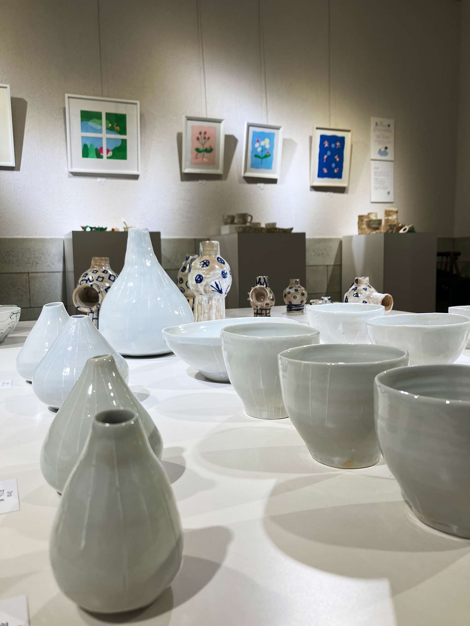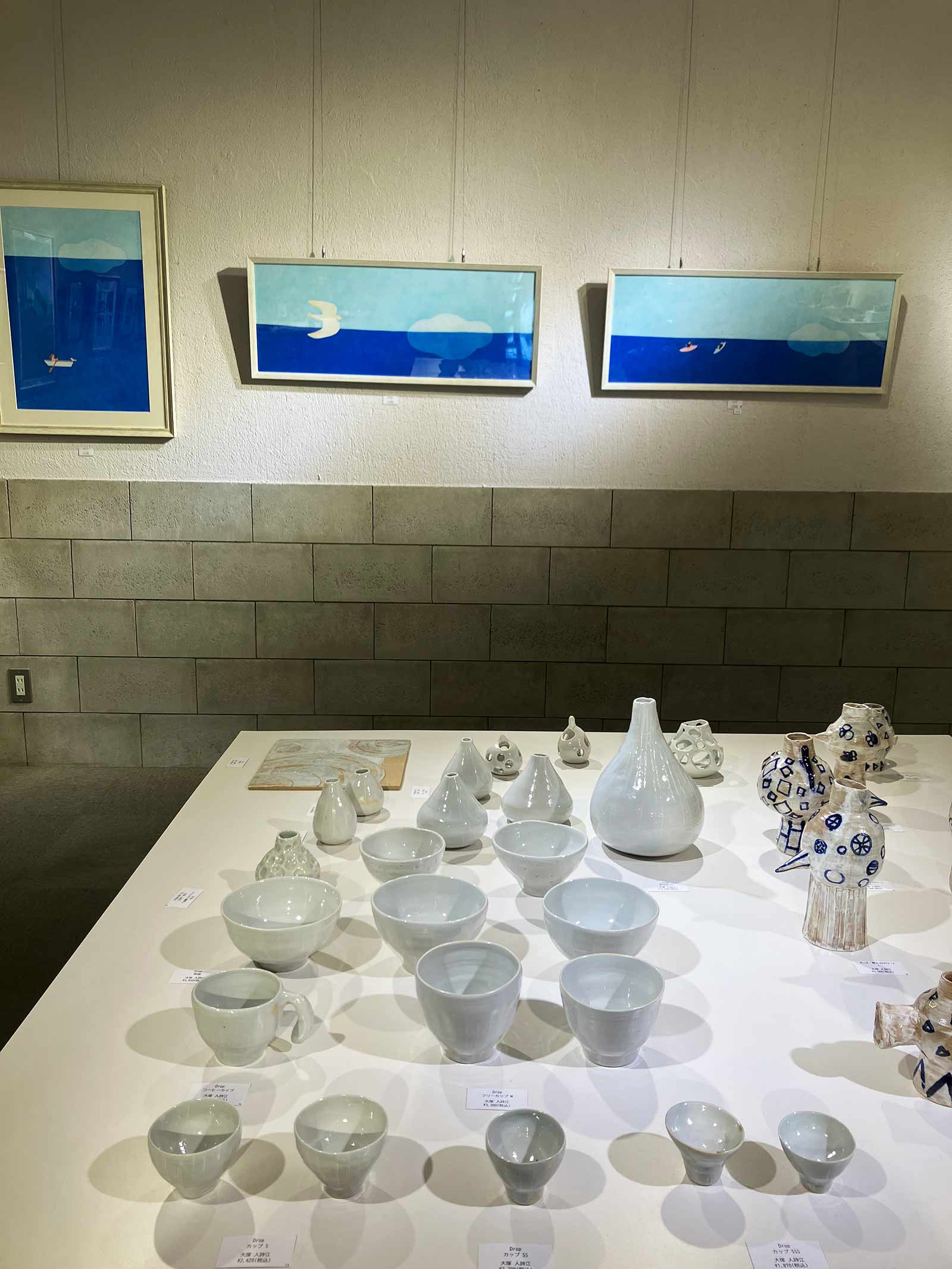 6月ということもあり、ギャラリー正面に飾られた、さのさんのブルーの絵と私の白い器や花器、そして白と青のトリたちがいいコラボレーションになりました。